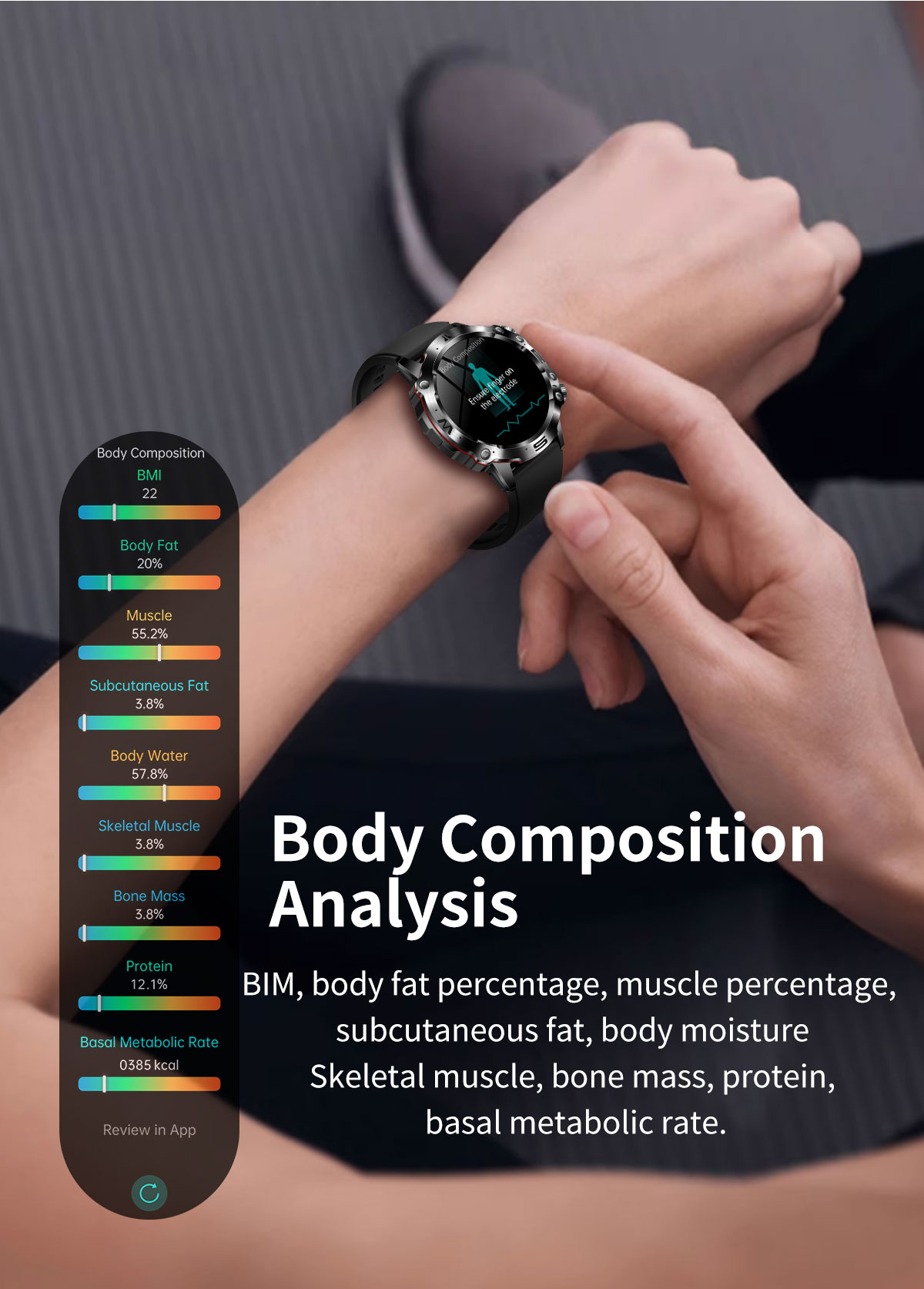 6. Pozostałe funkcje: Pomiar temperatury ciała,Tryby treningowe (100+), pomiar intensywności wysiłku, przypomnienie o piciu wody, pomiar stresu, SOS, Pomiar ECG