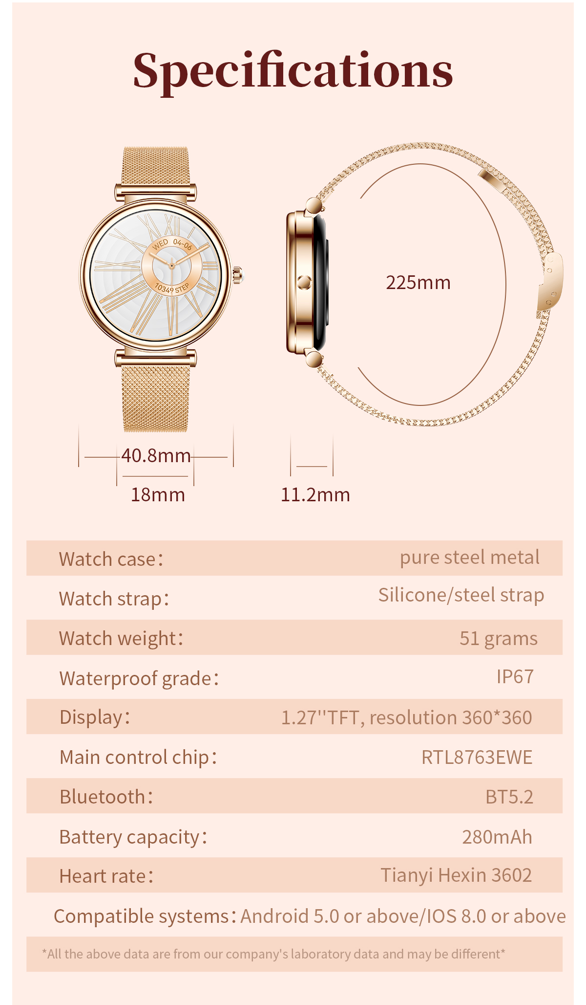 Zegarek posiada możliwość zmiany motywu głównego, możliwość wgrywania własnej tapety. Nowoczesna technologia pozwala zegarkowi na współpracę z systemami iOS oraz kompatybilność z popularnym systemem Android. Koperta o średnicy 41 mm, grubości 12 mm. Gwarancja 12 miesięcy. Do każdego egzemplarza dołączono instrukcję w języku polskim i firmową torbę.