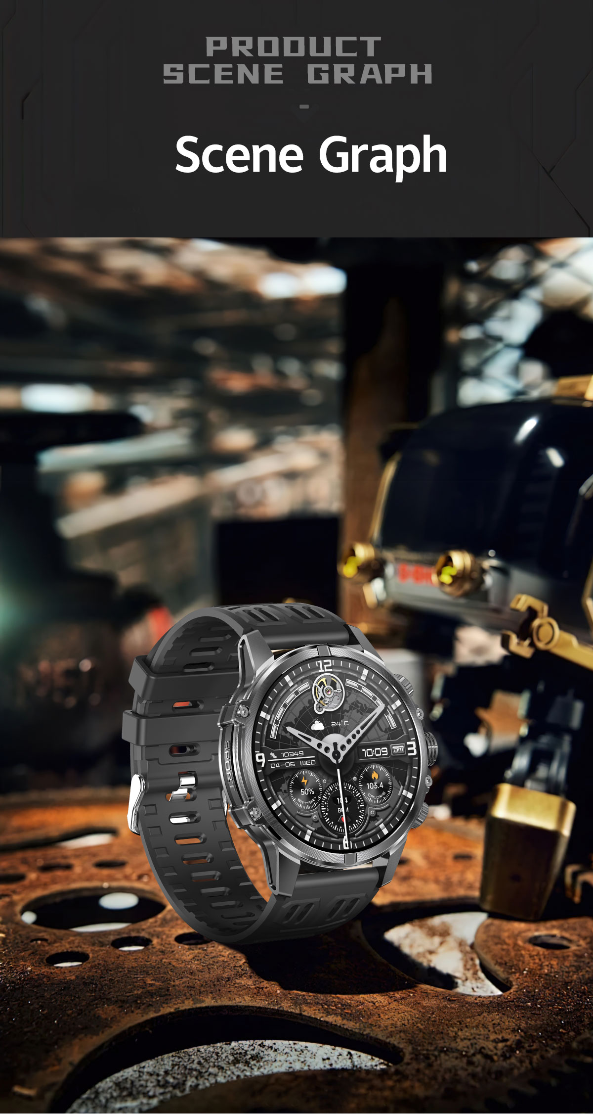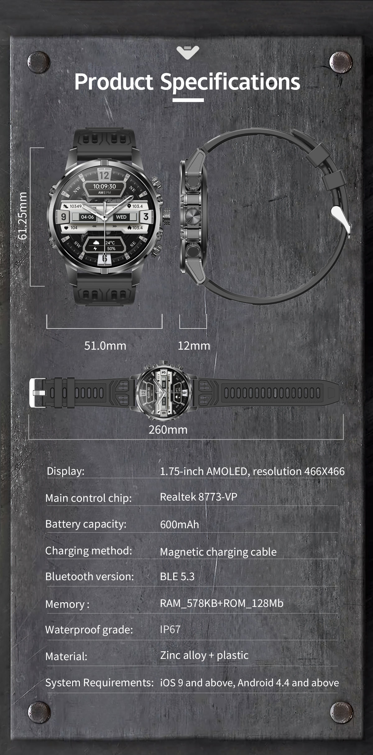 Zegarek posiada możliwość zmiany motywu głównego, możliwość wgrywania własnej tapety. Nowoczesna technologia pozwala zegarkowi na współpracę z systemami iOS oraz kompatybilność z popularnym systemem Android. Koperta o średnicy 51 mm, grubości 13 mm. Gwarancja 12 miesięcy. Do każdego egzemplarza dołączono instrukcję w języku polskim i firmową torbę.