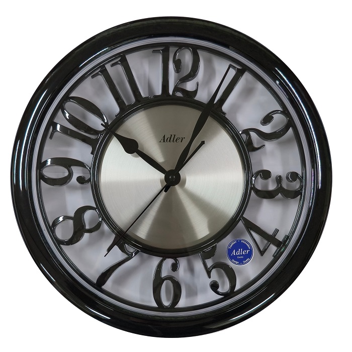 Czytelny zegar firmy Adler, w kolorze grafitowym z przezroczystą tarczą.