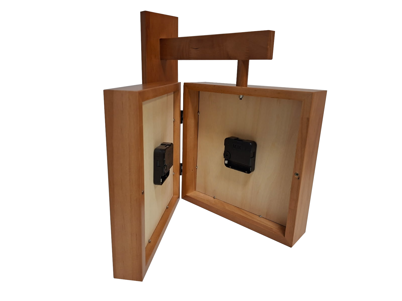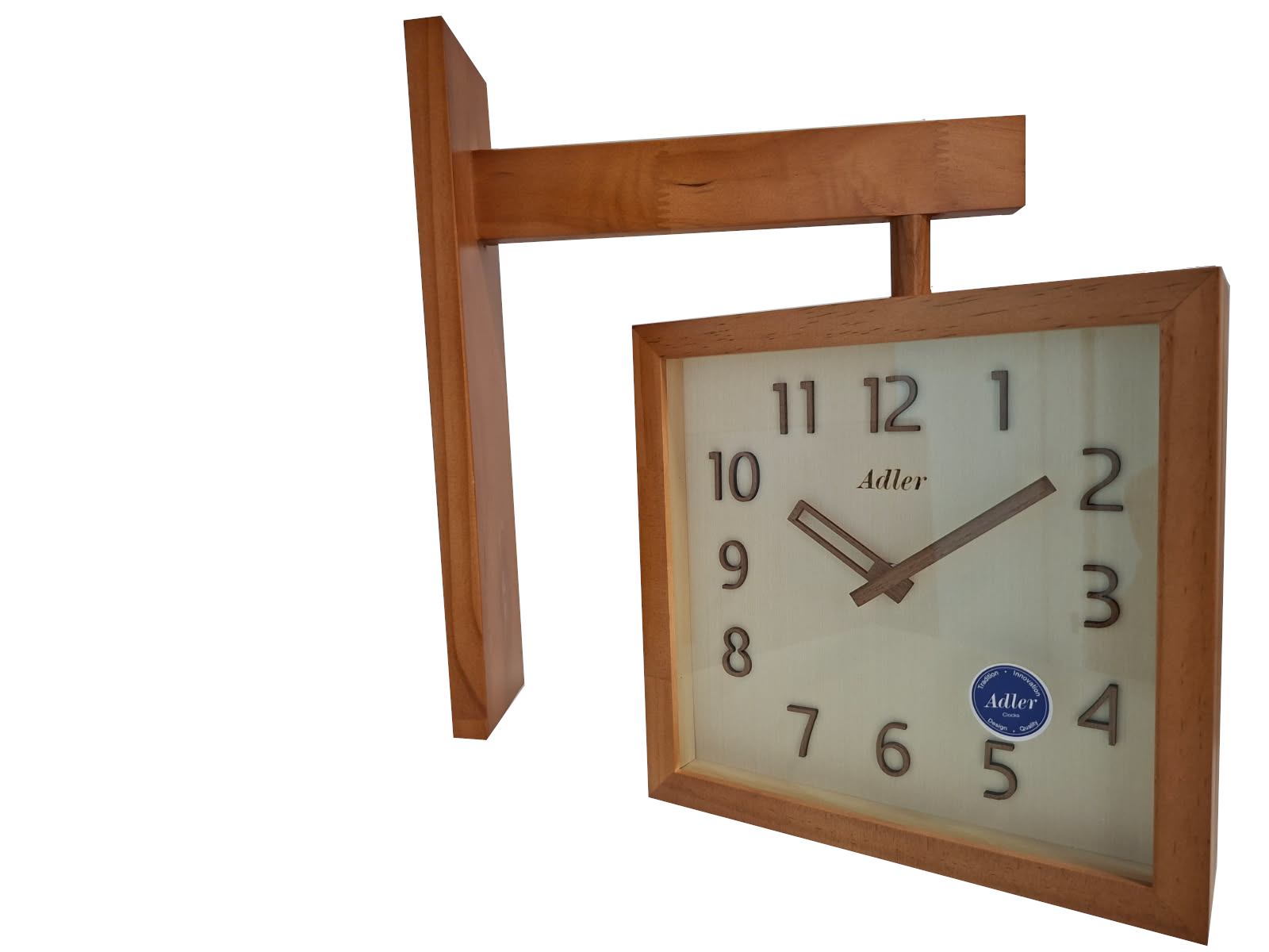 Czytelny zegar drewniany firmy Adler, w kolorze jasny orzech. Styl dworcowy, zegary po obu stronach z dwoma mechanizmami