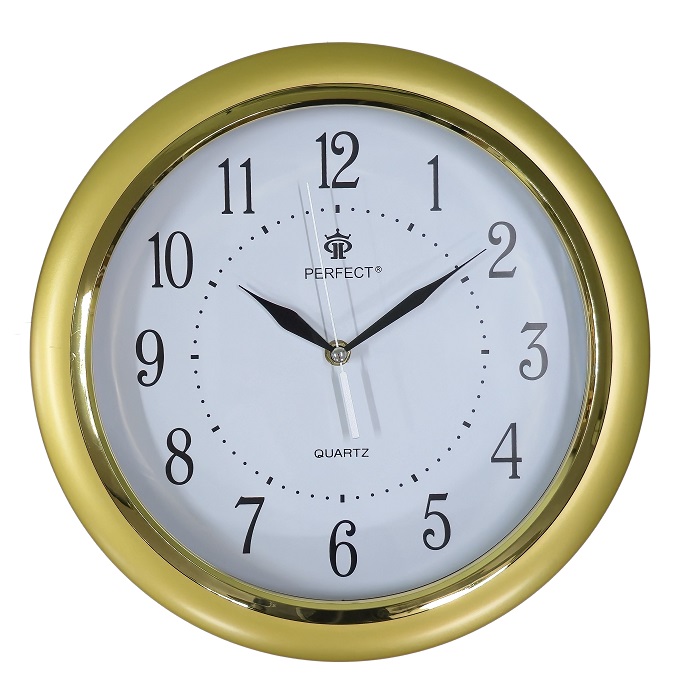 Czytelny zegar firmy Perfect, w kolorze złotym.